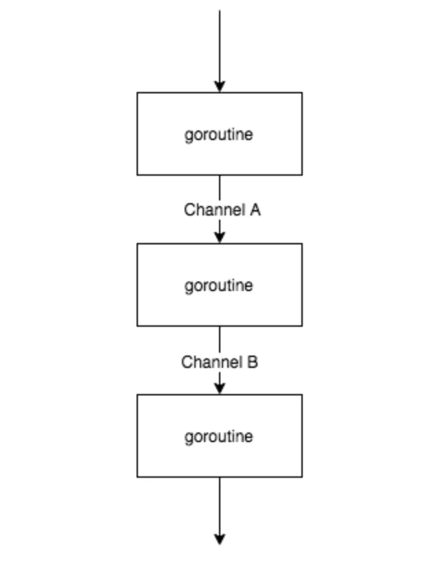 这个图不是很能表达并行的概念,其实三个 goroutine 是同时执行的,通过 buffer channel 将三者串起来,只要前序 goroutine 处理完一部分数据,就往下传递,达到并行的目的